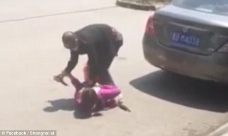 According to the two-minute-long video, the assailant hits his female victim, knocking her to the ground by a busy roadside.